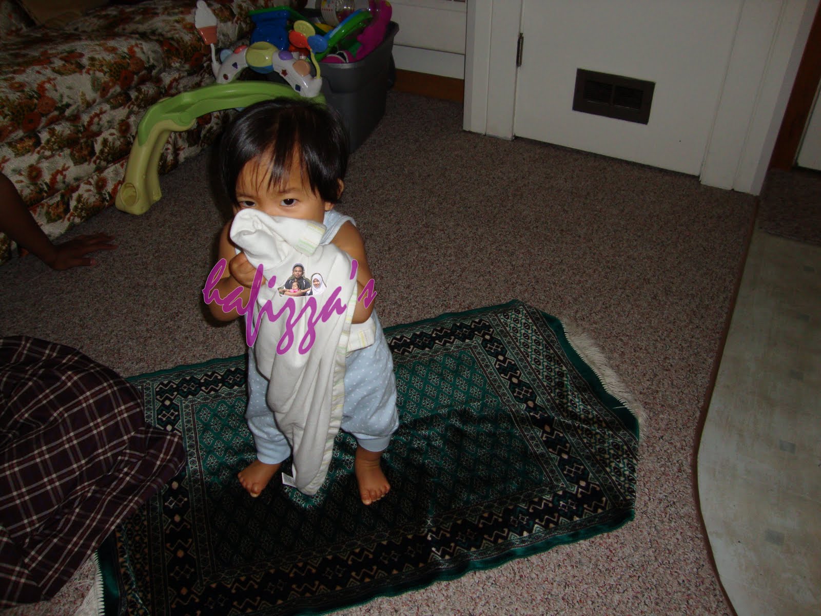 2) Malam tadi : bangun je jam 10 malam (tidur jam 8 malam), kerjanya asyik berjalan je, jalan dan lompat, panjat kerusi, pi kubey-kubey pinggan mangkuk.