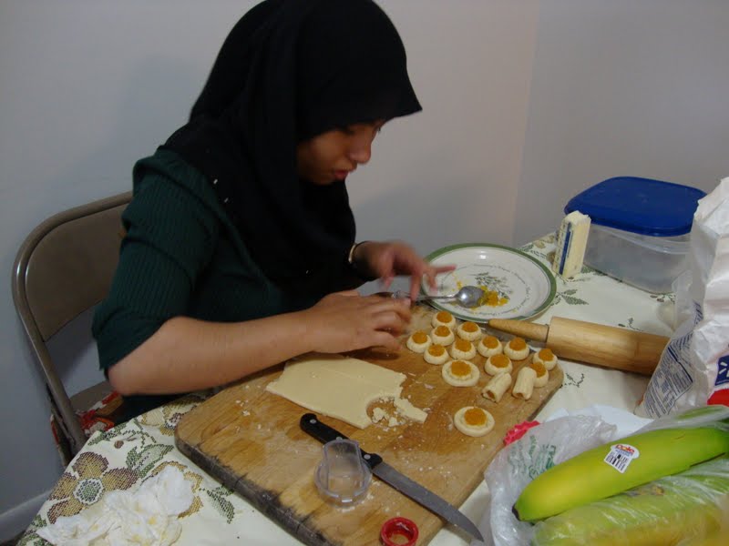 Nak dipendekkan cerita, acuan tat pulak tak ada. Bermacam-macam 'bekas acuan' yang kami gunakan, tapi satu pun tak jadi. Nak buat tat gulung, pecah-pecah pulak gulungannya tu. Dengan kekreatifan Azrina, jadilah tat nenas nya dengan menggunakan acuan 'tangan'. Buat sendirinye lubang-lubang untuk buh tat =)